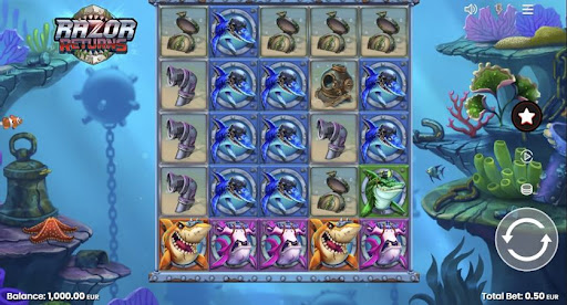 Die Symbole im Razor Returns Spielautomaten folgen dem Unterwasser-Thema mit verschiedenfarbigen Haien als hochwertige Symbole. Der weiße Hai fungiert als Wild-Symbol und bringt bei 5 gleichen Symbolen 12,5x Ihren Einsatz.